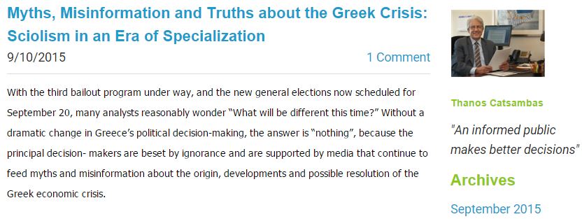 «Με το τρίτο πρόγραμμα διάσωσης υπό εξέλιξη και τις νέες γενικές εκλογές της 20ής Σεπτεμβρίου πολλοί αναλυτές εύλογα αναρωτιούνται τι θα είναι διαφορετικό αυτή τη φορά. Χωρίς μια δραματική αλλαγή στην πολιτική διαδικασία λήψης αποφάσεων στην Ελλάδα, η απάντηση είναι τίποτα».