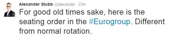 Ο υπουργός Οικονομικών της Φινλανδίας Άλεξ Στουμπ αποκάλυψε μέσα από το λογαριασμό του στο twitter με ποια σειρά κάθονται οι υπουργοί Οικονομικών στο τραπέζι του κρίσιμου Eurogroup.