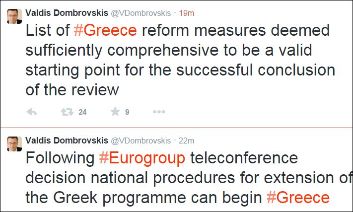 Σε συνέχεια της απόφασης της τηλεδιάσκεψης του Eurogroup, που ολοκληρώθηκε στις Βρυξέλλες, «οι εθνικές διαδικασίες για την επέκταση του ελληνικού προγράμματος μπορούν να ξεκινήσουν» αναφέρει με μήνυμά του στον προσωπικό του λογαριασμό στο twitter, ο αρμόδιος επίτροπος για το Eυρώ, Βάλντις Ντομπρόβσκις.