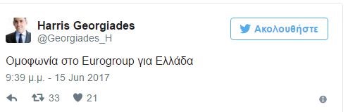 «Ομοφωνία στο Eurogroup για την Ελλάδα», έγραψε χαρακτηριστικά ο κ. Γεωργιάδης.Δείτε το tweet: