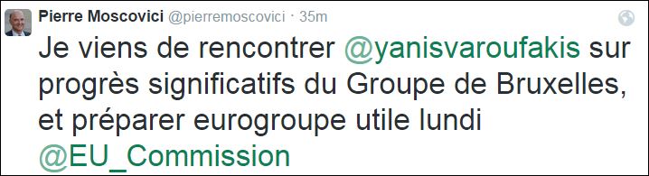 Στη συνάντηση που είχε με τον υπουργό, Οικονομικών Γιάνη Βαρουφάκη, αναφέρεται ο Γάλλος επίτροπος Οικονομίας Πιερ Μοσκοβισί, με ανάρτηση στον προσωπικό λογαριασμό του στο twitter.