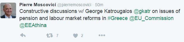 “Εποικοδομητικές συζητήσεις με τον Γιώργο Κατρούγκαλο σχετικά με συνταξιοδοτικά ζητήματα και μεταρρυθμίσεις στην αγορά εργασίας στην Ελλάδα” έγραψε ο κ. Μοσκοβισί στο Twitter.