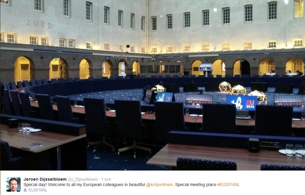 Στο tweet του, ο πρόεδρος του Eurogroup καλωσόρισε τους ευρωπαίους εταίρους στο εθνικό ναυτικό μουσείο της Ολλανδίας, το οποίο χαρακτηρίζει «ξεχωριστό μέρος συνάντησης»