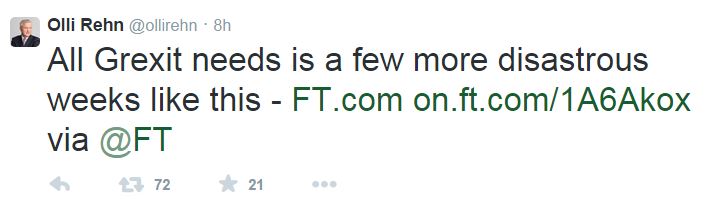 Τον τίτλο ενός άρθρου το οποίο αναφέρεται στην πιθανότητα του Grexit, κοινοποίησε με tweet ο Όλι Ρεν.