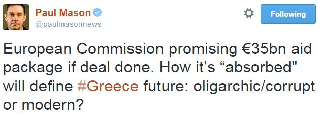 Ο Πολ Μέισον σχολιάζει με ένα tweet την υπόσχεση της Κομισιόν για πακέτο 35 δισ. ευρώ σε περίπτωση συμφωνίας.