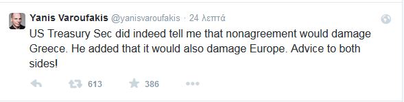 Συγκεκριμένα ο κ. Βαρουφάκης έγραψε. «Ο Αμερικανός υπουργός Οικονομικών, όντως μου είπε ότι μία μη-συμφωνία θα έκανε ζημιά στην Ελλάδα. Προσέθεσε ότι επίσης θα έκανε ζημιά και στην Ευρώπη. Συμβουλή και στις δύο πλευρές».