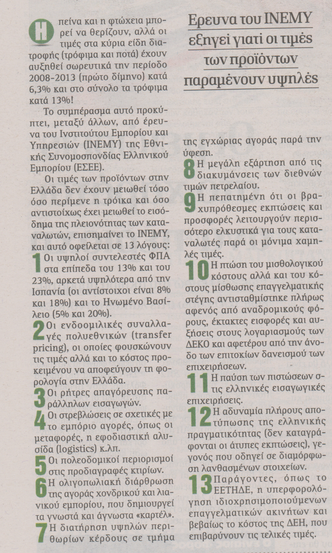 Η πείνα και η φτώχεια μπορεί να θερίζουν, αλλά οι τιμές στα κύρια είδη διατροφής έχουν αυξηθεί σωρευτικά την περίοδο 2008-2013 κατά 6,3% και στο σύνολο τα τρόφιμα κατά 13%.