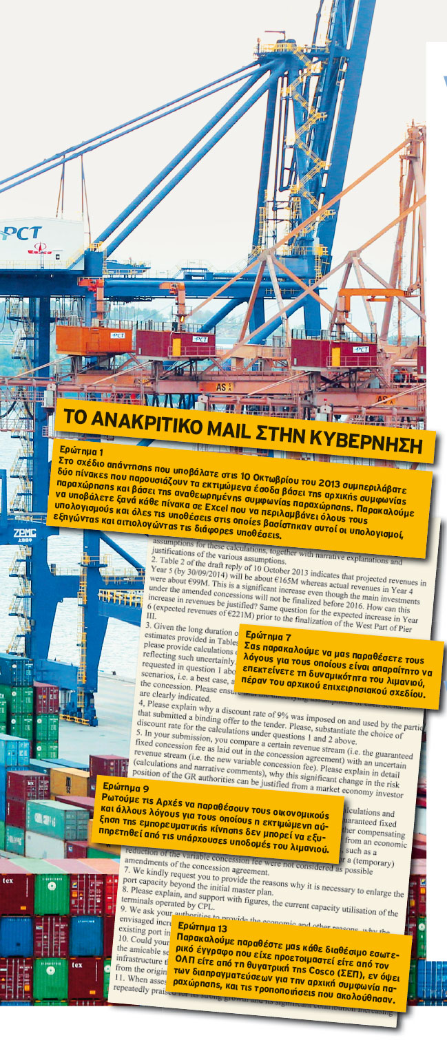 Με απορίες που προκαλούν… απορία, οι Ευρωπαίοι για ακόμη μία φορά παγώνουν τη διαδικασία επικύρωσης της συμφωνίας του ΟΛΠ με την Cosco. Ζητούν για παράδειγμα να μάθουν γιατί είναι απαραίτητο να επεκταθεί η δυναμικότητα του λιμανιού, πέραν του αρχικού σχεδιασμού, ρωτούν γιατί η εκτιμώμενη αύξηση της εμπορευματικής κίνησης δεν μπορεί να εξυπηρετηθεί από τις υπάρχουσες υποδομές του λιμανιού, ενώ ζητούν κάθε διαθέσιμο εσωτερικό έγγραφο που είχε προετοιμαστεί, εν όψει των διαπραγματεύσεων για την αρχική συμφωνία παραχώρησης και τις τροποποιήσεις που ακολούθησαν.
