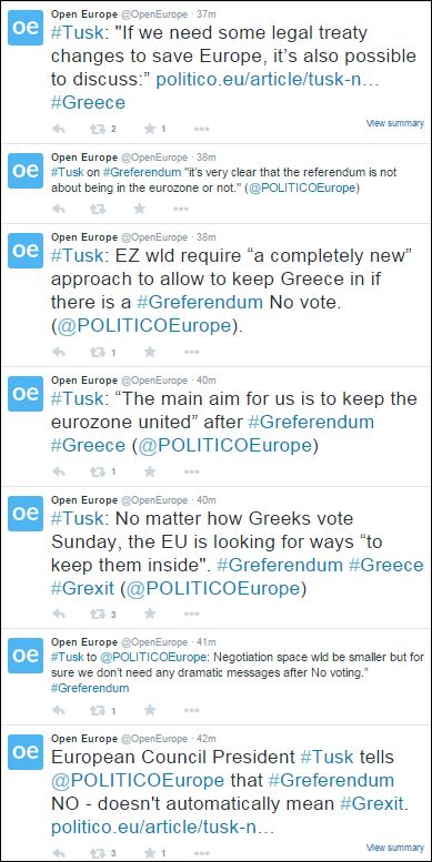 «Είναι σαφές ότι το δημοψήφισμα δεν αφορά στην παραμονή της Ελλάδας στην Ευρωζώνη» ανέφερε ο Πρόεδρος του Ευρωπαϊκού Συμβουλίου, Ντόναλντ Τουσκ σημειώνοντας ότι αν το αποτέλεσμα είναι “όχι” « δεν σημαίνει αυτόματα ένα Grexit».