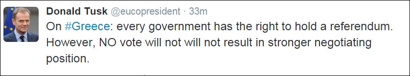 «Για την Ελλάδα: Κάθε κυβέρνηση έχει δικαίωμα να διεξάγει ένα δημοψήφισμα. Ωστόσο, το “όχι” δεν θα ενισχύσει τη διαπραγματευτική θέση», έγραψε στο twitter.
