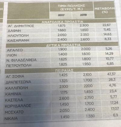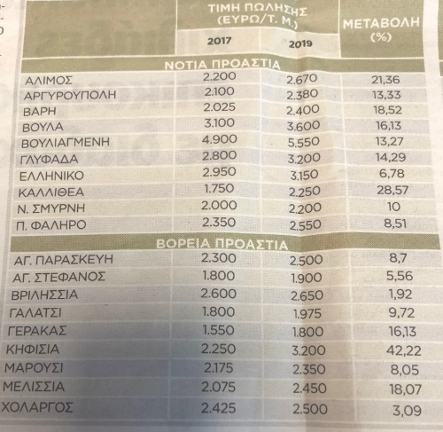 Ενδεικτική είναι η περίπτωση της Αγίας Σοφίας στον Πειραιά, όπου ένα διαμέρισμα πενταετίας, στον α’ όροφο, εμβαδού 90 – 110 τ.μ., πωλείται σήμερα για 2.100 ευρώ/τ.μ. έναντι 1.425 ευρώ/τ.μ. το 2017 (+47,37%), ενώ εξίσου εντυπωσιακή είναι η αύξηση που εμφανίζει το ίδιο διάστημα και η Κηφισιά (42,22%), με τη μέση τιμή να διαμορφώνεται στα 3.200 ευρώ/τ.μ., όταν προ τριετίας δεν ξεπερνούσε τα 2.250 ευρώ/τ.μ. Την πεντάδα συμπληρώνουν το Γουδή, με αύξηση 29,41% και πωλητήρια στα 2.200 ευρώ/τ.μ. (από 1.700 ευρώ/τ.μ. το 2017) και η Δραπετσώνα (28,3%, με κόστος αγοράς στα 1.700 ευρώ/τ.μ. έναντι 1.325 ευρώ/τ.μ. παλαιότερα).