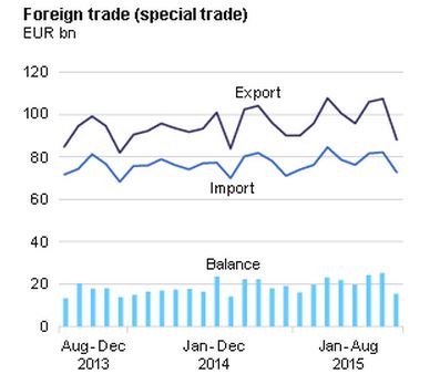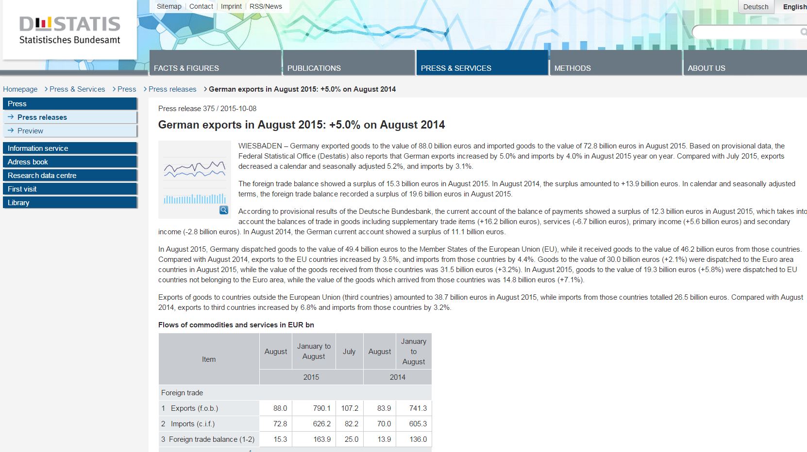 Σε ετήσια βάση, δηλαδή συγκριτικά με τον Αύγουστο του 2014, οι γερμανικές εξαγωγές αυξήθηκαν κατά 5%, όμως το εν λόγω στοιχείο δεν αντανακλά την πρόσφατη αποδυνάμωση της κινεζικής οικονομίας και τις επακόλουθες συνέπειες στις ασιατικές και παγκόσμιες αγορές. Μεγαλύτερη του αναμενόμενου ήταν και η πτώση στις εισαγωγές, η οποία έφτασε το 3,1%.