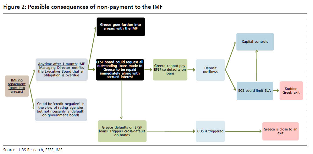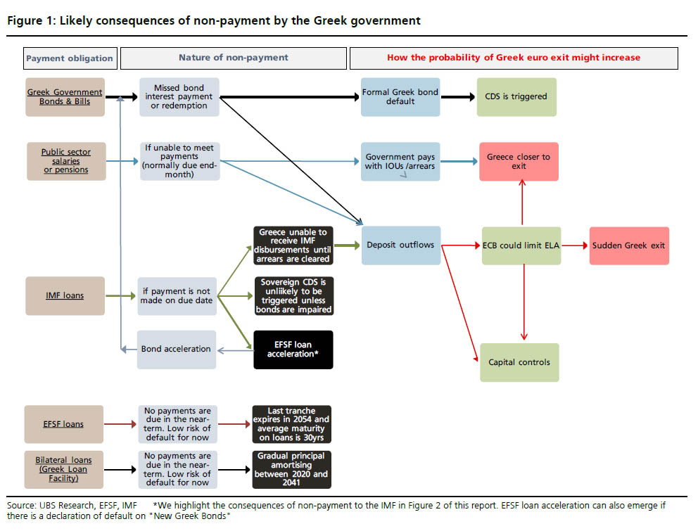 Το σταυροδρόμι προς το Grexit αποτυπώνει σε δυο γραφήματα UBS, σχηματοποιώντας δυο πιθανούς δρόμους για μια ενδεχόμενη έξοδο από το ευρώ στη σκιά των πιέσεων δανειστών και αγορών.