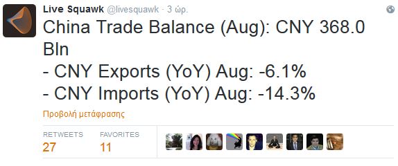 Στην Κίνα οι εξαγωγές τον Αύγουστο σημείωσαν πτώση 5,5% σε σχέση με το αντίστοιχο διάστημα πέρσι, από πτώση 8,3% που είχε σημειωθεί τον Ιούλιο. Εδώ να επισημανθεί ότι στις αρχές Αύγουστο, το Πεκίνο αποφάσισε να υποτιμήσει το γουαν έναντι του δολαρίου κατά 2%, γεγονός που δικαιολογεί τα καλύτερα στοιχεία του Αυγούστου. Οι εκτιμήσεις των οικονομολόγων έκαναν λόγο για υποχώρηση των εξαγωγών κατά 6,6% σε ετήσια βάση.