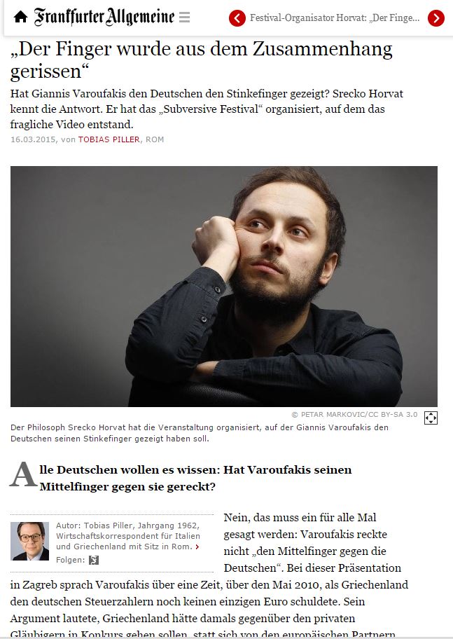 “Όλοι οι Γερμανοί θέλουν να γνωρίζουν: Ο Βαρουφάκης ύψωσε το μεσαίο δάχτυλο κατά των Γερμανών;” ήταν η ερώτηση που του έκανε ο δημοσιογράφος της FAZ.