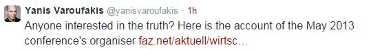 “Ενδιαφέρεται κανείς για την αλήθεια;” έγραψε ο Γιάνης Βαρουφάκης παραθέτοντας στη συνέχεια ένα άρθρο της γερμανικής FAZ που φιλοξενεί συνέντευξη του διοργανωτή του συνεδρίου, από το οποίο προέρχεται το βίντεο, Srecko Horvat.