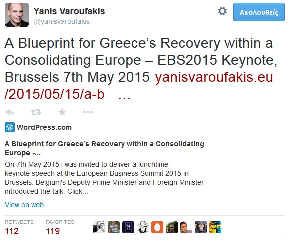 Τις θέσεις του για την ελληνική κρίση αλλά και την ανάπτυξη στην Ελλάδα, που διατύπωσε στο Europe Business Sumit ο υπουργός Οικονομικών Γιάνης Βαρουφάκης, ανήρτησε σήμερα στο προσωπικό του Blog, ενημερώνοντας με ένα tweet.