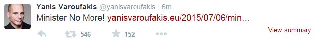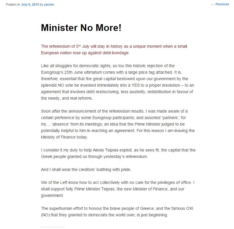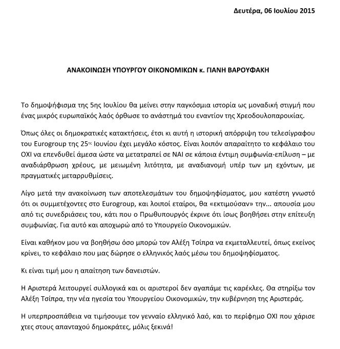 Μετά την ανακοίνωση του αποτελέσματος του δημοψηφίσματος, έγινα γνώστης της προτίμησης συγκεκριμένων υπουργών του Eurogroup, να απουσιάζω από τις συνεδριάσεις. Μία ιδέα που ο πρωθυπουργός, έκρινε ότι μελλοντικά θα βοηθήσει στην επίτευξη συμφωνίας. Για αυτόν τον λόγο, αποχωρώ από το υπουργείο Οικονομικών σήμερα”.