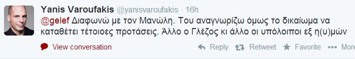 “Διαφωνώ με τον Μανώλη. Του αναγνωρίζω όμως το δικαίωμα να καταθέτει τέτοιες προτάσεις. Άλλο ο Γλέζος και άλλο οι υπόλοιποι εξ η(υ)μών”, έγραψε χαρακτηριστικά ο Γ. Βαρουφάκης, στον προσωπικό του λογαριασμό στο twitter.