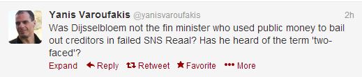 «Δεν ήταν ο Ντάισελμπλουμ ο υπουργός Οικονομικών που χρησιμοποίησε δημόσιο χρήμα για να διασώσει τους καταθέτες της Sns Reaal; Αναρωτιέμαι αν έχει ακούσει ποτέ τον όρο… διπρόσωπος», σχολιάζει ο Γιάνης Βαρουφάκης για τον πρόεδρο του Eurogroup.