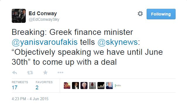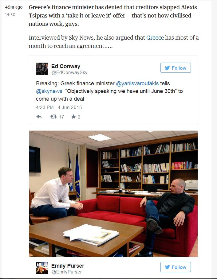 «Η παρέμβαση του Γιάνη Βαρουφάκη έρχεται εν μέσω ελπίδων ότι οι συνομιλίες θα έχουν ολοκληρωθεί μέχρι το τέλος αυτής της εβδομάδας. Η Ελλάδα έχει μέχρι το τέλος του μήνα», αναφέρει με μήνυμά του στο Twitter ο δημοσιογράφος του Sky News, Ed Conway, που πριν από λίγη ώρα ολοκλήρωσε τη συνέντευξή του με τον Έλληνα υπουργό.
