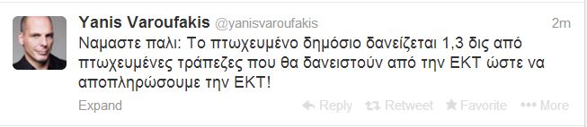 “Να ‘μαστε πάλι: Το πτωχευμένο δημόσιο δανείζεται 1,3 δισ. από πτωχευμένες τράπεζες που θα δανειστούν από την ΕΚΤ ώστε να αποπληρώσουμε την ΕΚΤ!” γράφει ο γνωστός οικονομολόγος, Γιάννης Βαρουφάκης, στον προσωπικό του λογαριασμό στο twitter.