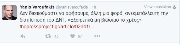 “Δεν δικαιούμαστε να αφήσουμε, άλλη μια φορά, ανεκμετάλλευτη την διαπίστωση του ΔΝΤ: «Εξαιρετικά μη βιώσιμο το χρέος»” έγραψε ο κ. Βαρουφάκης στο Twitter.
