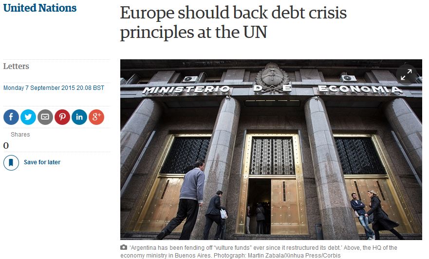 Κρούουν τον κώδωνα του κινδύνου, δε, σημειώνοντας: «Χθες ήταν η Αργεντινή, σήμερα είναι η Ελλάδα και αύριο, ίσως, η Γαλλία. Κάθε χρεωμένη χώρα μπορεί να αποκλειστεί από την αναδιάρθρωση του χρέους της κόντρα στην κοινή λογική. Η δημιουργία ενός νομικού πλαισίου για την αναδιάρθρωση του χρέους, επιτρέπει σε κάθε κράτος να λύσει τα προβλήματα χρέους της, χωρίς τον κίνδυνο της οικονομικής κατάρρευσης ή την απώλεια της εθνικής κυριαρχίας της. Είναι ένα θέμα που επείγει για την προώθηση της χρηματοπιστωτικής σταθερότητας».