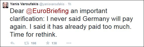 Διευκρινίσεις για τη δήλωση του για τη Γερμανία έδωσε ο Γιάννης Βαρουφάκης με ανάρτηση στον προσωπικό του λογαριασμό στο Twitter. Ο υπουργός Οικονομικών εξήγησε πως δεν δήλωσε ότι η Γερμανία θα πληρώσει ξανά, αντιθέτως υποστήριξε πως ήδη έχει πληρώσει πολλά προτείνοντας την επανεξέταση του ζητήματος.