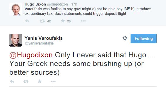 Έναν έντονο διάλογο είχε ο υπουργός Οικονομικών, Γιάνης Βαρουφάκης, με τον συντάκτη του Reuters, Hugo Dixon. Ο τελευταίος έγραψε στο twitter: