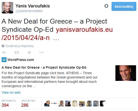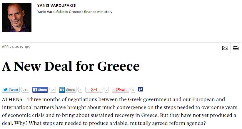Αυτά δεν σημαίνουν πως δεν μπορεί να βρεθεί κοινό έδαφος αμέσως, καταλήγει. «Η ελληνική κυβέρνηση θέλει μια οδό δημοσιονομικής εξυγίανσης που να έχει νόημα, και θέλουμε μεταρρυθμίσεις που όλες οι πλευρές πιστεύουν ότι είναι σημαντικές. Το καθήκον μας είναι να πείσουμε τους εταίρους μας, πως οι ενέργειές μας είναι πιο πολύ στρατηγικές, παρά κινήσεις τακτικής, και πως η λογική μας είναι υγιής. Καθήκον τους είναι να εγκαταλείψουν μια προσέγγιση που έχει αποτύχει».