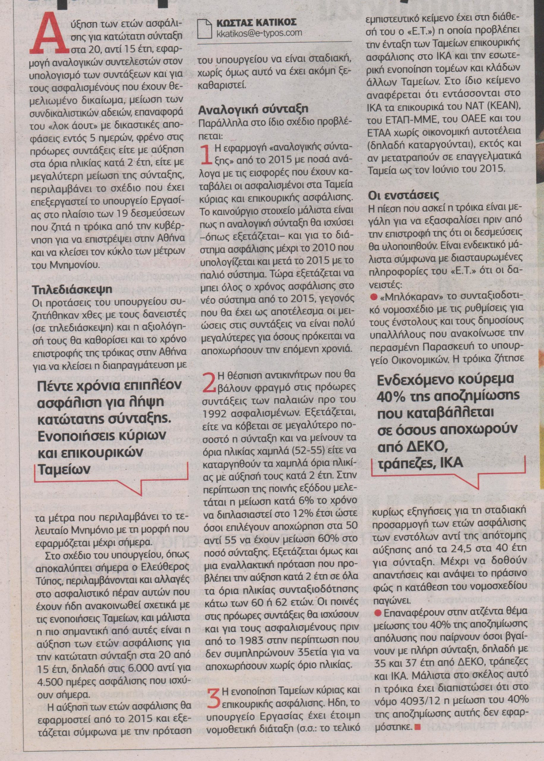 Αύξηση των ετών ασφάλισης για κατώτατη σύνταξη στα 20, αντί 15 έτη, εφαρμογή αναλογικών συντελεστών στον υπολογισμό των συντάξεων και για τους ασφαλισμένους που έχουν θεμελιωμένο δικαίωμα, μείωση των συνδικαλιστικών αδειών, επαναφορά του “λοκ άουτ” με δικαστικές αποφάσεις εντός 5 ημερών, φρένο στις πρόωρες συντάξεις είτε με αύξηση στα όρια ηλικίας κατά 2 έτη, είτε με μεγαλύτερη μείωση της σύνταξης, περιλαμβάνει το σχέδιο που έχει επεξεργαστεί το υπουργείο Εργασίας στο πλαίσιο των 19 δεσμεύσεων που ζητά η τρόικα από την κυβέρνηση για να επιστρέψει στην Αθήνα και να κλείσει τον κύκλο των μέτρων του μνημονίου.