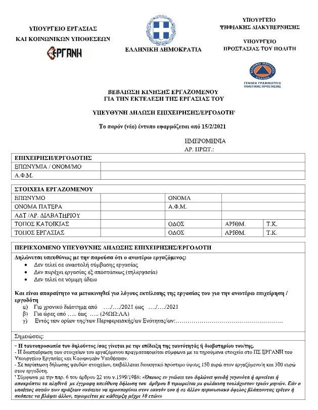 Για την ομαλή μετάβαση στα νέα έντυπα Βεβαίωσης Κίνησης του Εργαζόμενου δίνεται μεταβατικό διάστημα εφαρμογής και χρήσεως μέχρι και την 17/2/2021 και ώρα 06:00΄. Για το διάστημα από 15/2/2021 και ώρα 06.00΄ έως και 17/2/2021 και ώρα 05:59΄, οι εργαζόμενοι μπορούν να μετακινούνται από και προς την εργασία τους με τα παλαιά έντυπα φόρμες – άδειες κυκλοφορίας εργαζομένου.