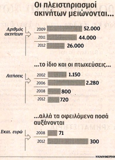 Στο σφυρί βγήκαν 26.000 ακίνητα το 2012, παρά το θεσμικό πλαίσιο που ισχύει για την προστασία της πρώτης κατοικίας, από τους πλειστηριασμούς. Η προστασία αφορά ακίνητα αξίας έως 200.000 ευρώ και ανανεώθηκε το 2013 για πέμπτη συνεχή χρονιά, προκειμένου να εκτονωθεί η πίεση προς δανειολήπτες με χρέη προς τις τράπεζες από στεγαστικά κυρίως δάνεια, αλλά και άλλες οφειλές για τις οποίες έχει ενεχυριαστεί η πρώτη κατοικία.