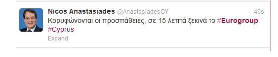 “Κορυφώνονται οι προσπάθειες”, έγραψε ο Νίκος Αναστασιάδης στο Τwitter, προαναγγέλλοντας την έναρξη της συνεδρίασης του Εurogroup.