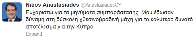 Το “ευχαριστώ” του Αναστασιάδη μέσω twitter