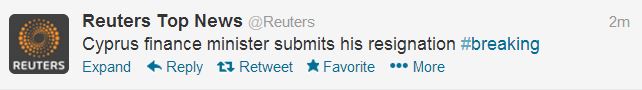 Την παραίτησή του έθεσε στη διάθεση του Προέδρου της Κυπριακής Δημοκρατίας, Νίκο Αναστασιάδη, ο υπουργός Οικονομικών, Μιχάλης Σαρρής, όπως είπε ο ίδιος στο τέλος συνέντευξης Τύπου με τον κυβερνητικό εκπρόσωπο και τους υπουργούς Παιδείας και Ενέργειας, με θέμα τη συμφωνία για το κυπριακό μνημόνιο.