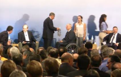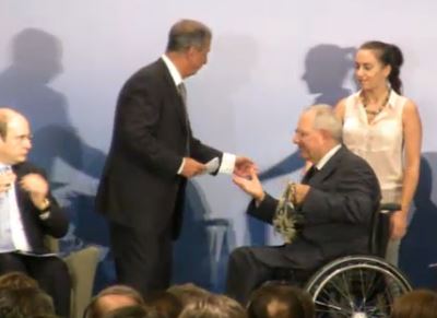Αμέσως μετά το τέλος της τοποθέτησης του Γερμανού υπουργού Οικονομικών, Βόλφγκανγκ Σόιμπλε, οι ιθύνοντες του Ελληνογερμανικού εμπορικού και βιομηχανικού επιμελητηρίου, του παρέδωσαν ένα στεφάνι από ελιά.