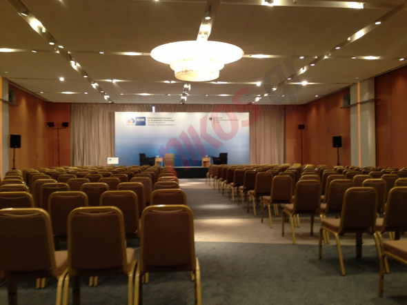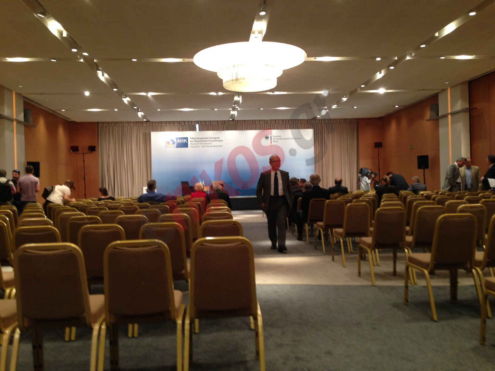 Η αίθουσα του ξενοδοχείου Χίλτον όπου σε λίγη ώρα θα μιλήσει ο Γερμανός υπουργός Οικονομικών, αρχίζει να γεμίζει με κόσμο.