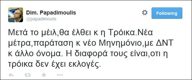 Παράταση του μνημονίου υπό άλλο όνομα και νέα μέτρα προβλέπει ο Δημήτρης Παπαδημούλης με ανάρτηση στον προσωπικό του λογαριασμό στο Twitter μετά το mail της τρόικας που άναψε «φωτιές» στις διαπραγματεύσεις με την ελληνική κυβέρνηση.