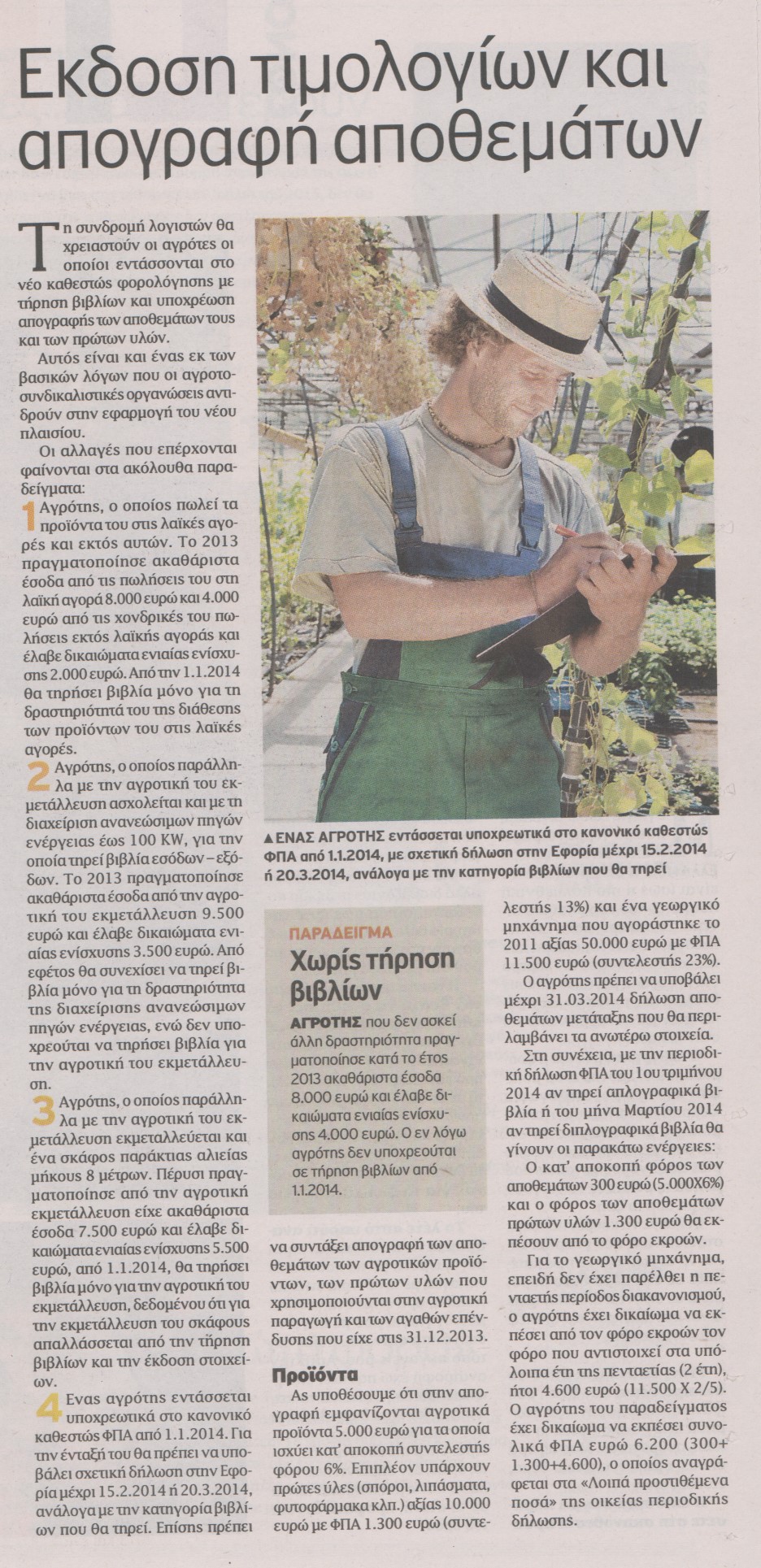Σύμφωνα με το δημόσιευμα του “Έθνους”, όσοι το 2013 είχαν τζίρο από πωλήσεις ή παραδόσεις αγροτικών προϊόντων που ξεπερνούσε τα 10.000 ευρώ ή έλαβαν κοινοτικές επιδοτήσεις πάνω από 5.000 ευρώ υποχρεούνται να τηρούν βιβλία, να εκδίδουν παραστατικά τιμολόγια, ακόμη και αποδείξεις λιανικής πώλησης και ταυτόχρονα να υποβάλλουν δηλώσεις ΦΠΑ.