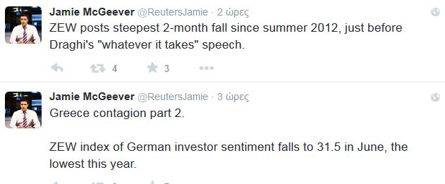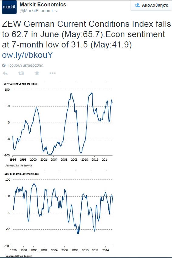 «Εξωγενείς παράγοντες περιορίζουν το περιθώριο περαιτέρω βελτίωσης της καλής οικονομικής κατάστασης της Γερμανίας. Σε αυτούς περιλαμβάνονται, ιδιαίτερα, η συνεχιζόμενη αβεβαιότητα για το μέλλον της Ελλάδας και η περιορισμένη δυναμική της παγκόσμιας οικονομίας», δήλωσε ο Πρόεδρος του ZEW, Κλέμενς Φιστ.