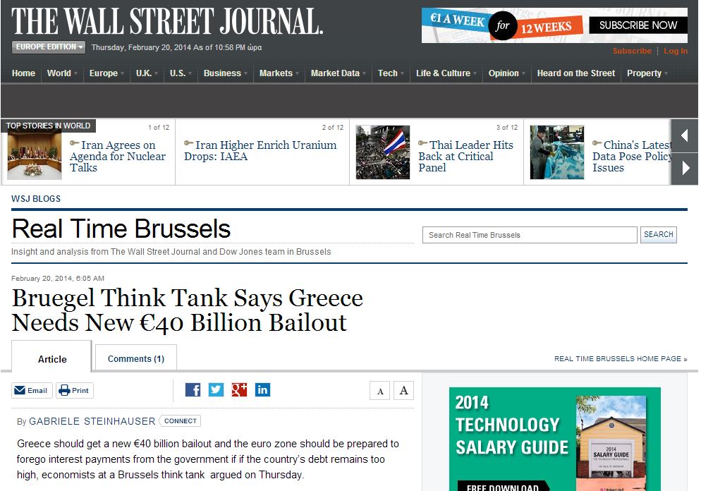 Η Ελλάδα θα πρέπει να λάβει νέο πακέτο ενίσχυσης ύψους 40 δισ. ευρώ και η Ευρωζώνη θα πρέπει να είναι έτοιμη να «συγχωρέσει» τους τόκους, αν το χρέος της χώρας παραμείνει πολύ υψηλό, αναφέρεται σε έκθεση οικονομολόγων της δεξαμενής σκέψης Bruegel που δημοσιοποιήθηκε σήμερα, επισημαίνεται σε δημοσίευμα στην ηλεκτρονική σελίδα της Wall Street Journal.