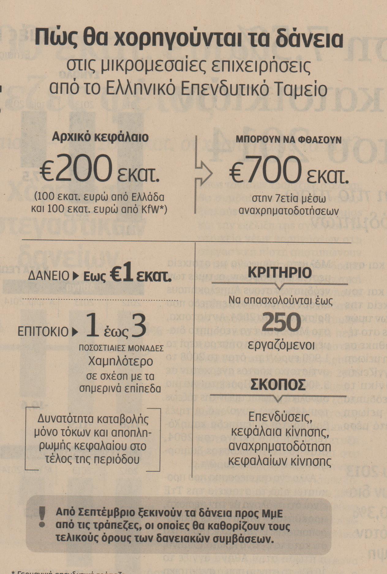 1. Το αρχικό κεφάλαιο για τις ΜμΕ θα είναι 200 εκατ. ευρώ, εκ των οποίων τα 100 εκατ. ευρώ έχει διαθέσει η Ελλάδα και τα υπόλοιπα 100 εκατ. ευρώ η KfW με την εγγύηση της γερμανικής κυβέρνησης. Το ποσό αυτό θα μπορεί να ανέλθει στα 700 εκατ. ευρώ μέσω ανακύκλωσης των πιστώσεων.