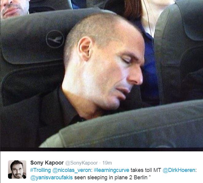 Το ενδιαφέρον πολλών χρηστών του twitter έχει προκαλέσει μία φωτογραφία του υπουργού Οικονομικών, Γιάνη Βαρουφάκη να κοιμάται στο αεροπλάνο.