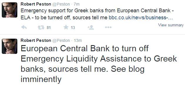 Δημοσιογράφος του BBC γράφει με tweet πως η ΕΚΤ θα εκβιάσει τραβώντας την πρίζα της ρευστότητας.
