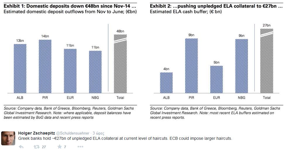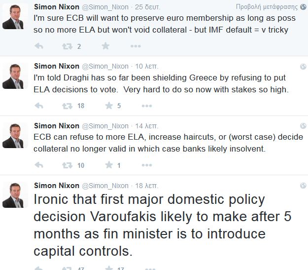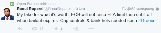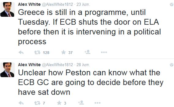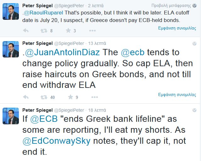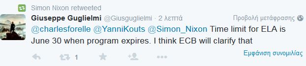 Άλλο tweet λέει για πληροφορίες από την Αθήνα ότι θα υπάρξει συνέχεια της «ένεσης» του ELA, ενώ άλλοι μιλούν για πολιτική απόφαση εάν υπάρξει διακοπή του ELA και αναρρωτιούνται για τις… διαρροές πριν το τέλος της συνεδρίασης του ΔΣ που ξεκίνησε 12 μμ.