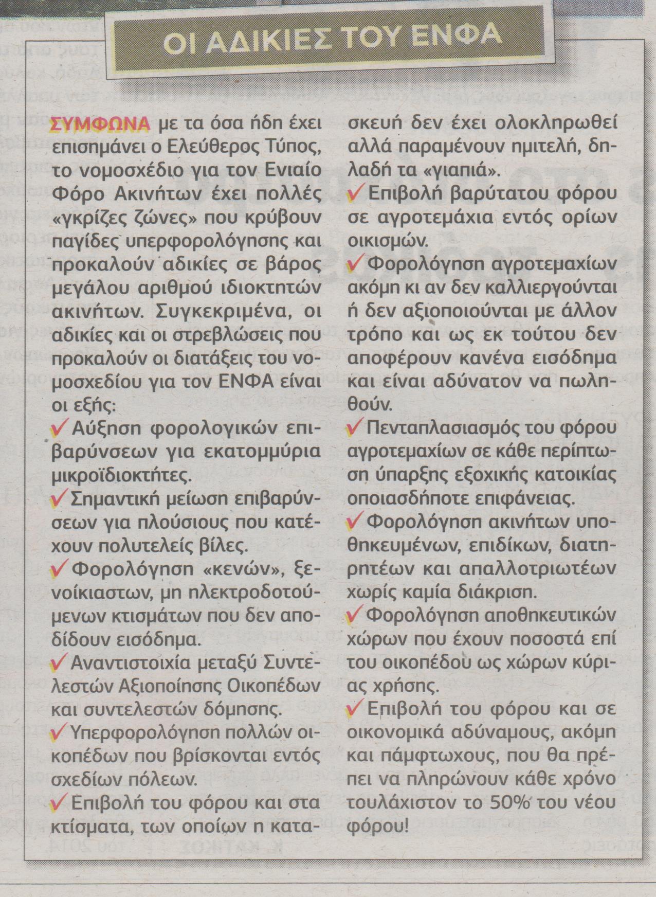 Αυτό επιβάλλεται και από τις περιστάσεις καθώς οι περισσότεροι ιδιοκτήτες ακινήτων θα υπερφορολογηθούν και δε θα καταφέρουν να εξοφλήσουν και τα ποσά του ΕΝΦΑ.