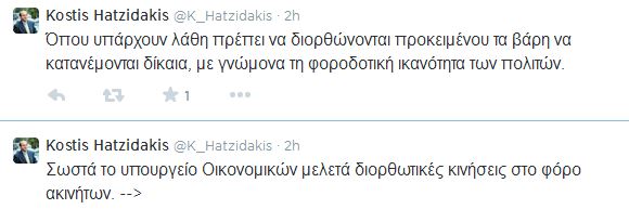 Συγκεκριμένα, σε μήνυμά του στο twitter ο κ. Χατζηδάκης επισημαίνει: «Σωστά το υπουργείο Οικονομικών μελετά διορθωτικές κινήσεις στο φόρο ακινήτων», προσθέτοντας «όπου υπάρχουν λάθη, πρέπει να διορθώνονται, προκειμένου τα βάρη να κατανέμονται δίκαια, με γνώμονα τη φοροδοτική ικανότητα των πολιτών».