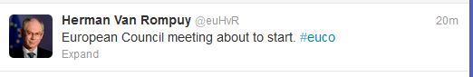 Ο πρόεδρος του Ευρωπαϊκού Συμβουλίου Χέρμαν Βαν Ρομπάι, ενημέρωσε μέσω Twitter πριν από περίπου 20 λεπτά ότι ετοιμάζεται να ξεκινήσει η Σύνοδος Κορυφής στις Βρυξέλλες.”Ξεκινά η Σύνοδος Κορυφής..”, έγραψε .